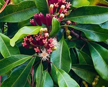 Tree and Leaves, The clove tree is a medium-sized evergreen that grows up to 8–12 m tall under ideal conditions. Its bark is smooth, and the leaves are opposite, glossy green, and aromatic when crushed.